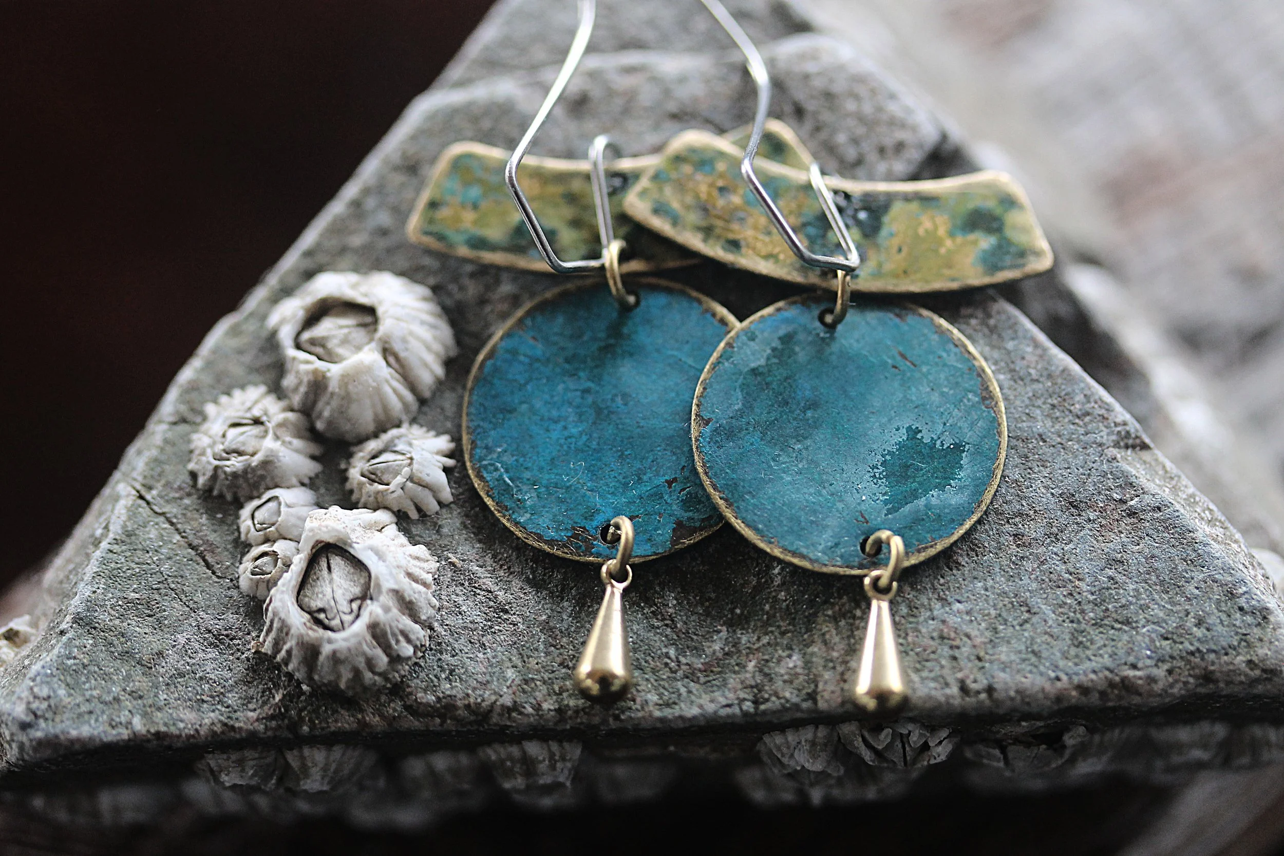 COMPONENTS: In these cheerful dangle earrings, I paired raw brass and brass in metal tone with premium Czech glass beads - in three shapes and sizes. The hues are summery, smile-generating and fresh. All of the brass components are also covered in the Grand Manan Patina - one I achieved by applying to them different natural ingredients, and then leaving them in the open, salty air of the Island, to “age”. The patina is raw - meaning that there will be slight alternations in it from time to time - as if the metal were alive.